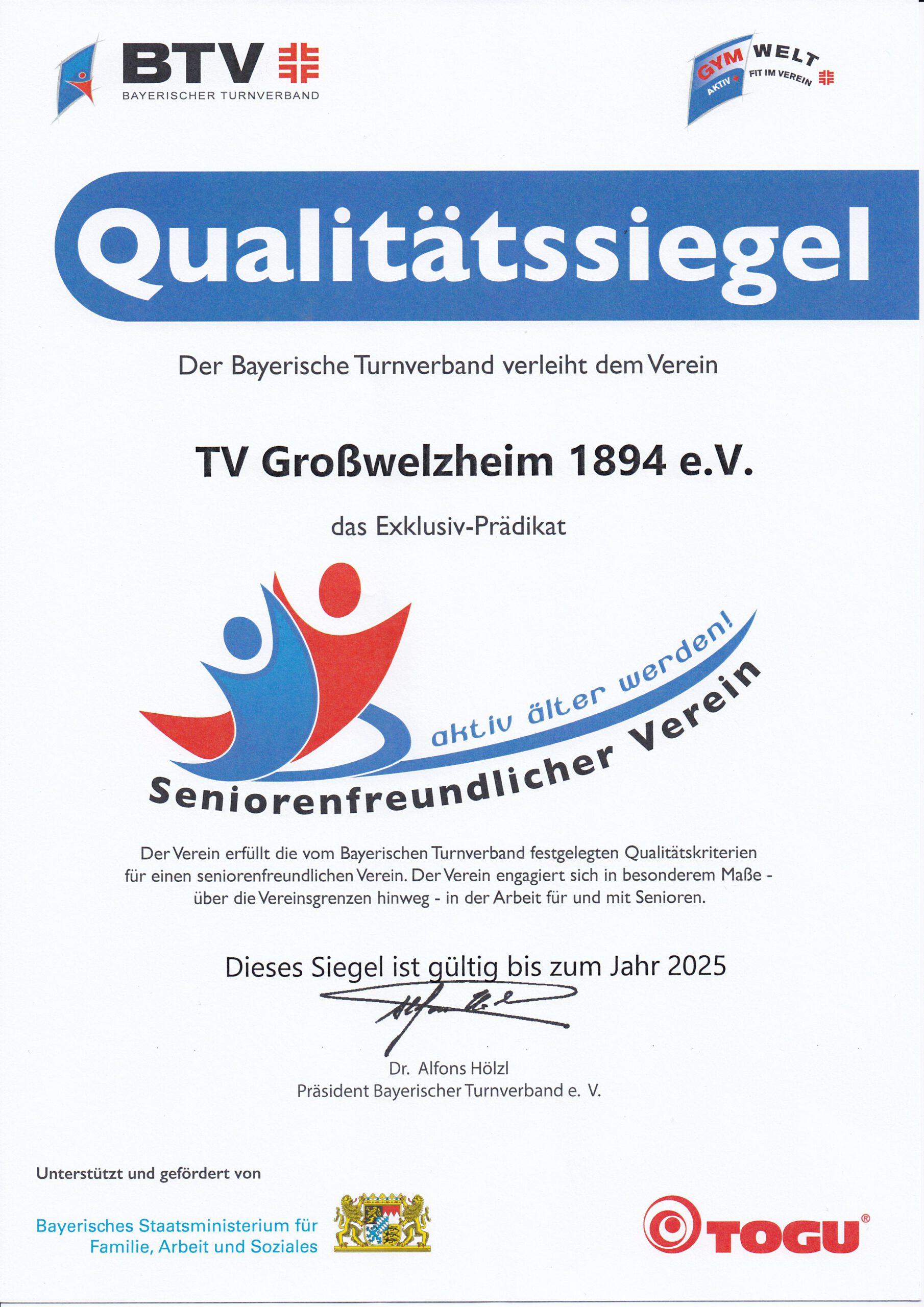 Der Bayerische Turnverband e.V. hat das dem Turnverein 1894 e.V. Großwelzheim im Jahr 2018 verliehene Qualitätssiegels „Seniorenfreundlicher Verein“ verlängert. Bewertet wird hierbei unter anderem das Bewegungsangebot für ältere Menschen sowie die Ausbildung und Lizenzierung von Übungsleiter*innen im Bereich Sport für Ältere.