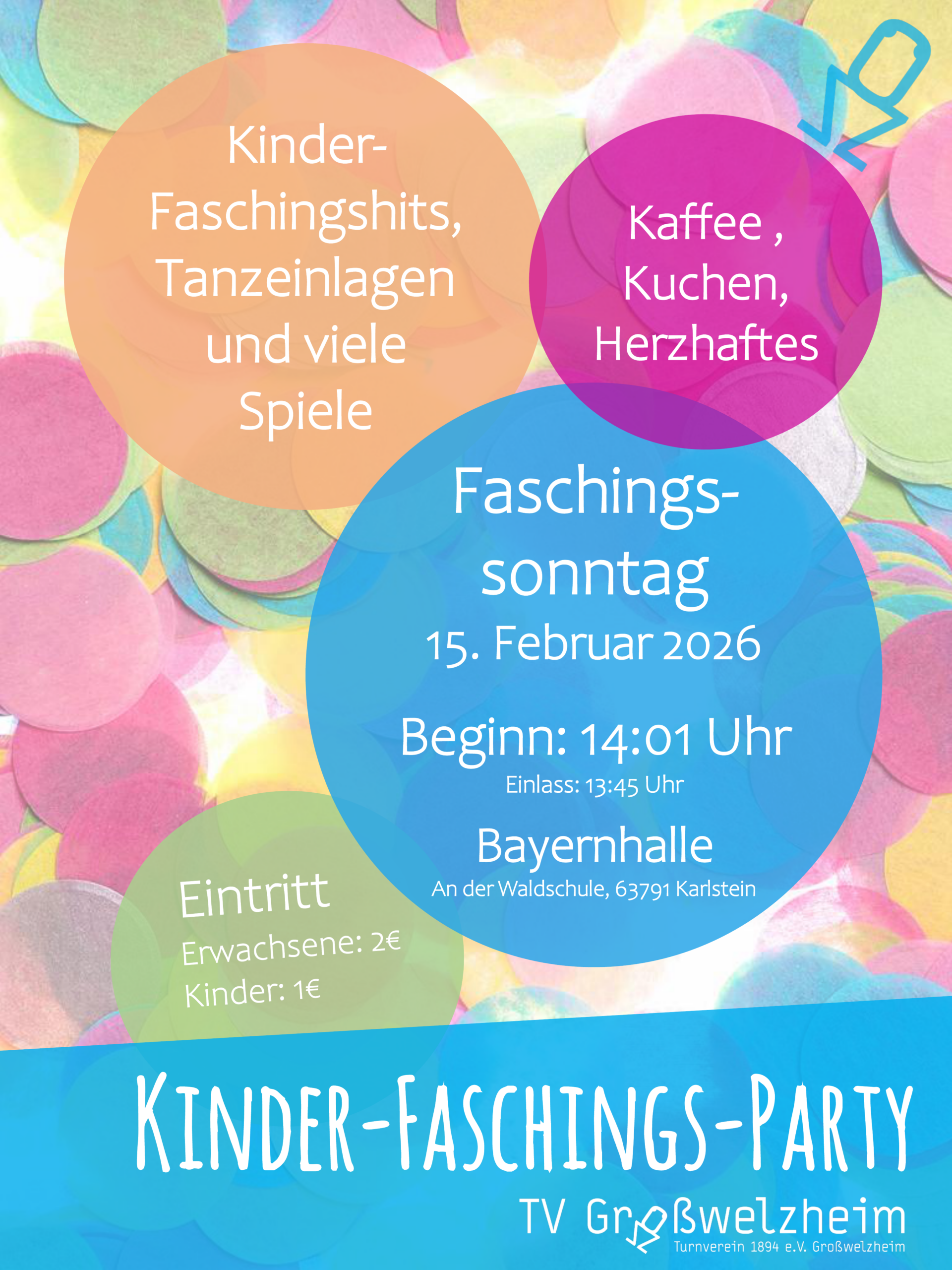 Am Sonntag, 15.02.2026 ziehen wir wieder los mit ganz großen Schritten – und zwar in der Bayernhalle, wo der TV Großwelzheim auch in diesem Jahr wieder seinen traditionellen Kinderfasching ausrichtet.